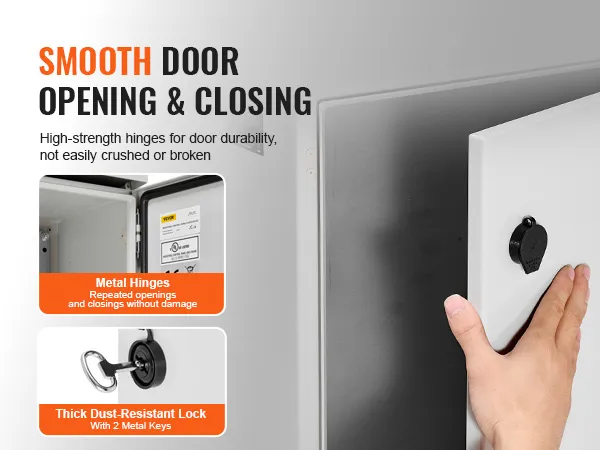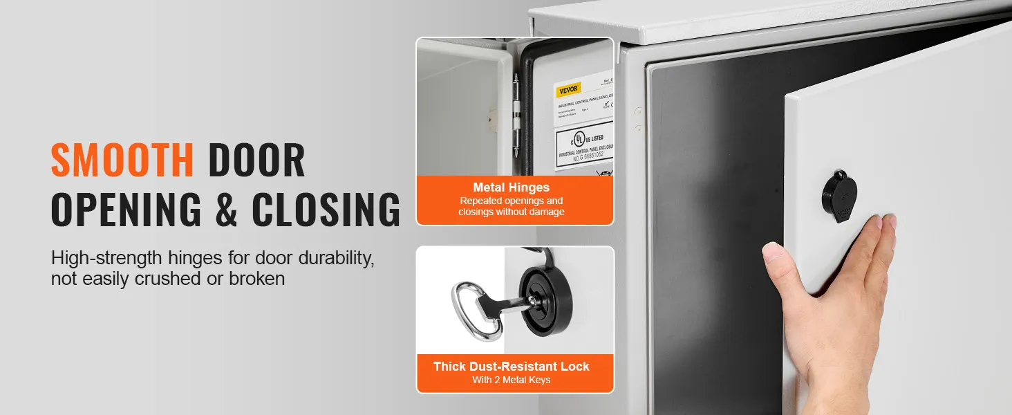 • Reinforced Lock & Hinge: The electrical outdoor enclosure features a high-quality lock core to increase security and lockability, making it less likely to fall off. The high-strength hinged lid is designed to ensure that the door is not easily damaged or broken due to squeezing.