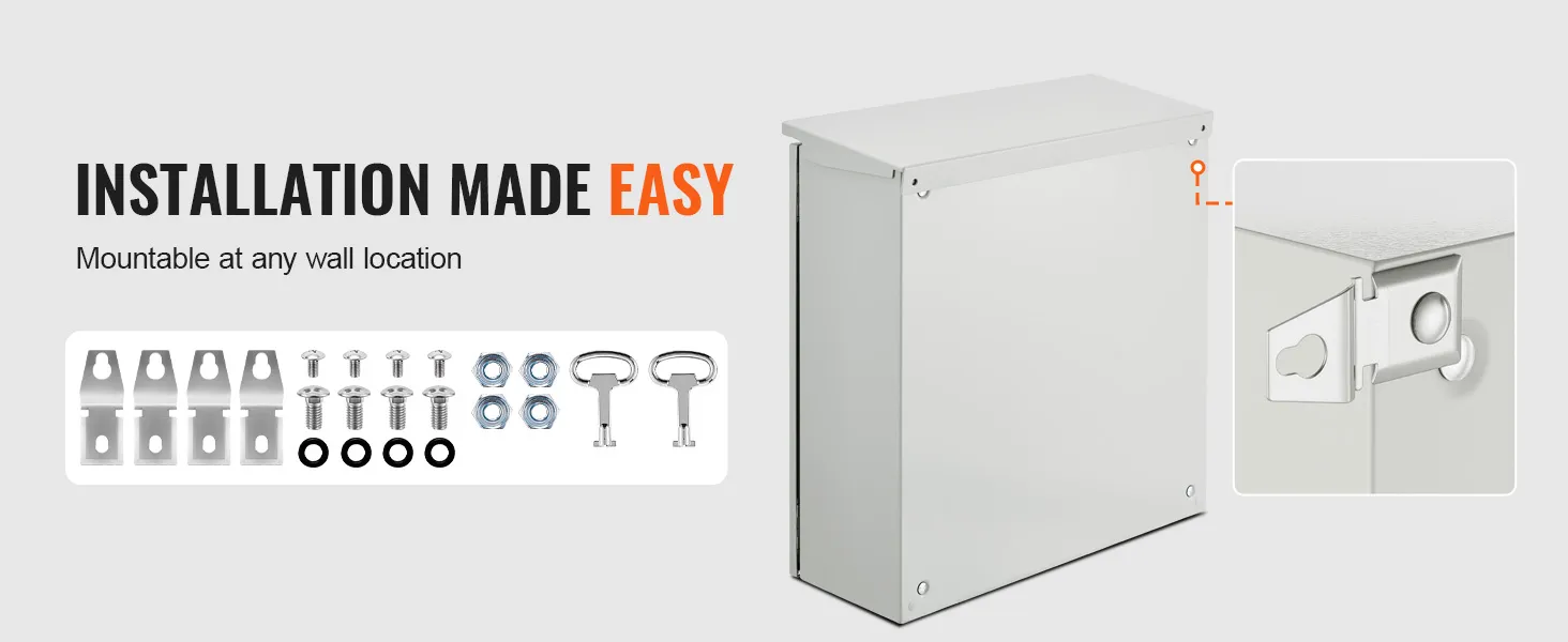 • Convenient Operation: The metal electrical enclosure box is equipped with a detachable galvanized mounting backplate for the effortless installation of electrical components. Complete accessories and four mounting holes on the back can quickly fix the NEMA enclosure on the wall.
