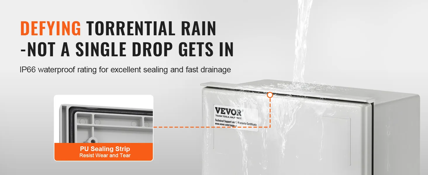 The VEVOR outdoor electrical enclosure is a practical choice for reliable electrical installations. You can trust it to perform well in challenging conditions. The design is suitable for both indoor and outdoor use. It's ideal for dusty environments and wet areas; the enclosure keeps your equipment safe from the elements. The robust construction provides a secure and reliable solution for your needs, ensuring durability through tough conditions without compromising on performance. NEMA 4X rating guarantees protection in various settings.