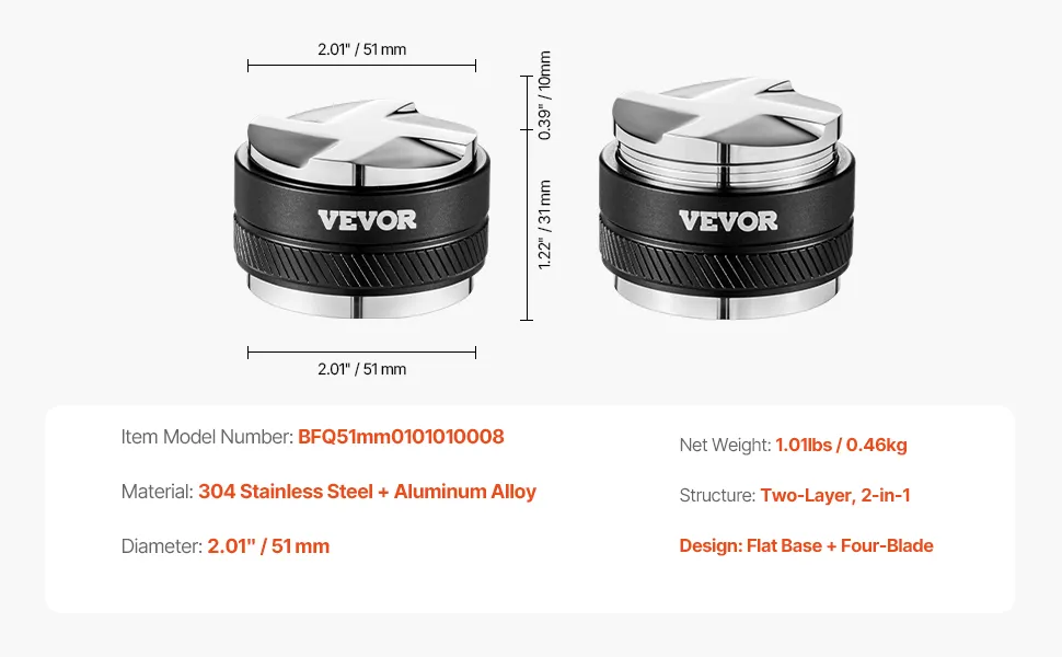 51mm 2-in-1 Gravity Coffee Distributor: This coffee distributor features dual-side design for both distribution and tamping. It can easily switching between the two to enhance coffee preparation efficiency.