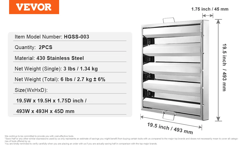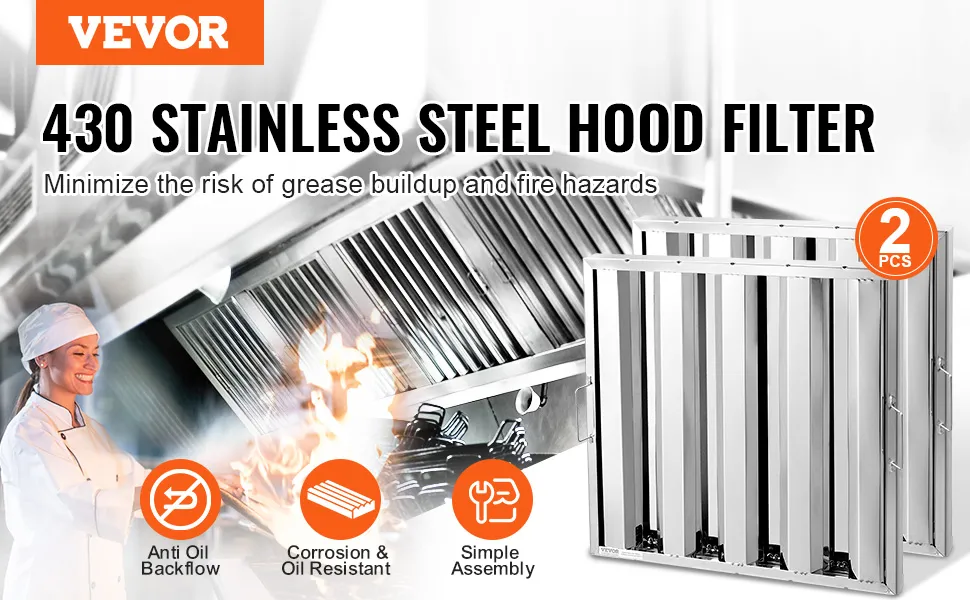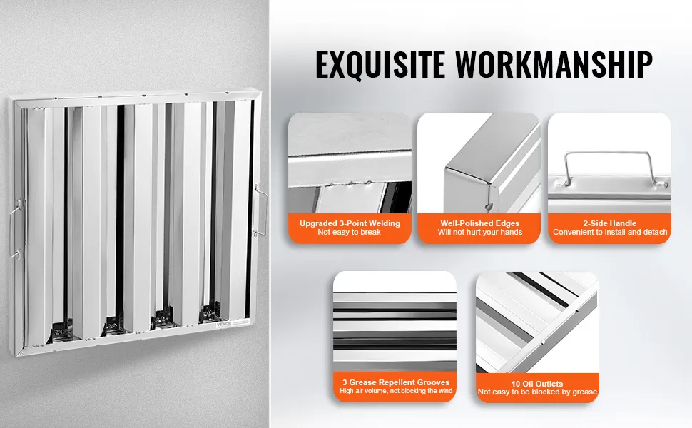 Easy Assembly & Removal: Equipped with convenient 2-side handles, this stainless steel hood filter is easy to install and detach, making maintenance a breeze. Please note that the hood shown in the picture is not included with the filter.