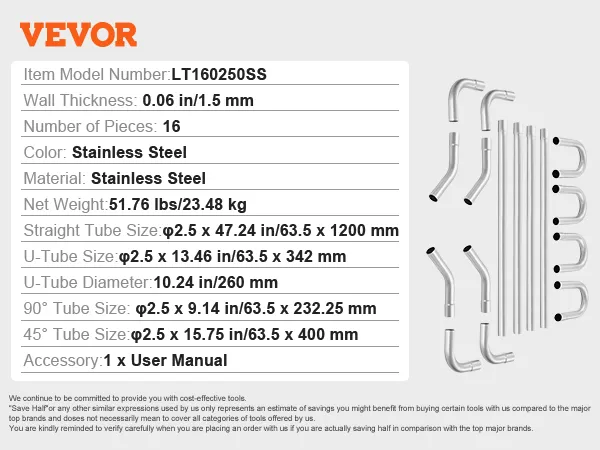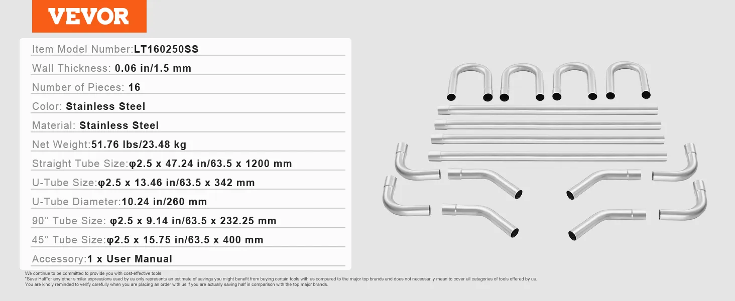 VEVOR Exhaust Kit, 16pcs, DIY Universal Stainless Steel Exhaust Kit with Slip-Fit Joint & Large Exhaust Tube, Rust-Proof Exhaust Pipe for Exhaust System, Fit for Garage/Auto Repair Store/4S Store