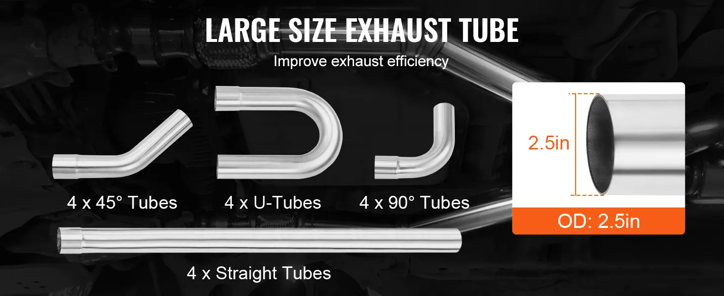 Complete Exhaust Kit: This exhaust pipe kit includes a total of 16 pipes with a 2.5-inch diameter, featuring 4 straight pipes, 4 90°pipes, 4 45°pipes, and 4 U-shaped pipes. This set is designed to give you the flexibility to fully customize your exhaust system for maximum efficiency.