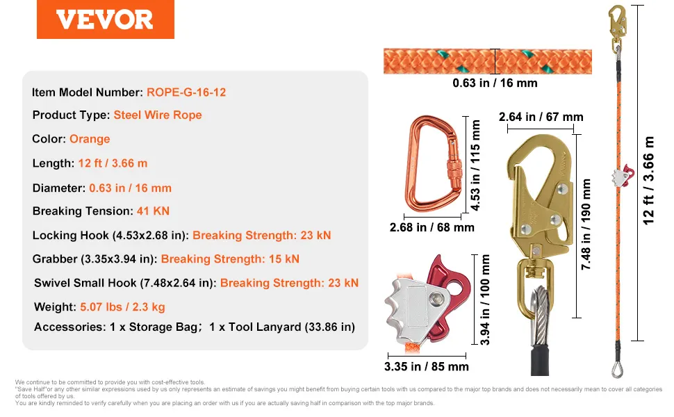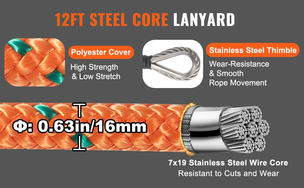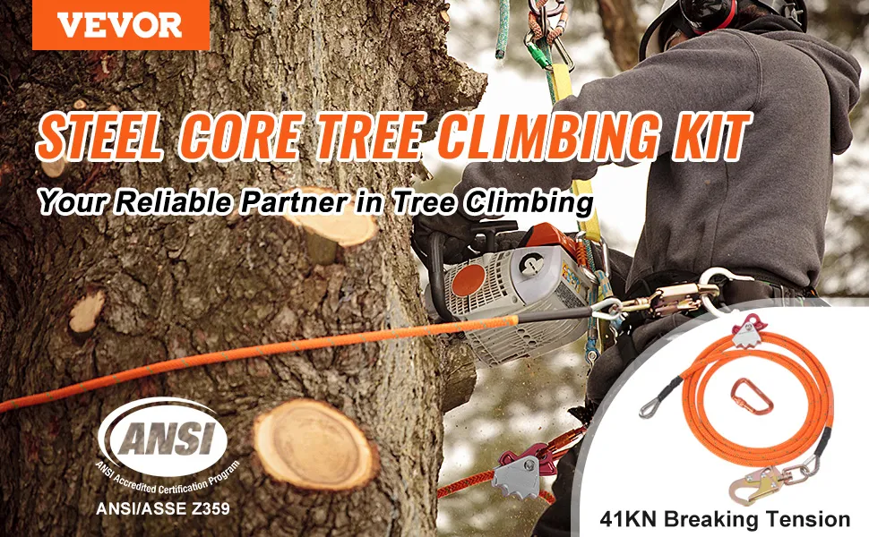 Climb with Confidence: Secure your tree climbing work at heights with the VEVOR 12ft steel-core flipline. This steel rope boasts a durable 0.6'' diameter and a robust 30 kn breaking strength, compliance with ANSI standards, ensuring your fall protection. A must-have tool for tree climbers.