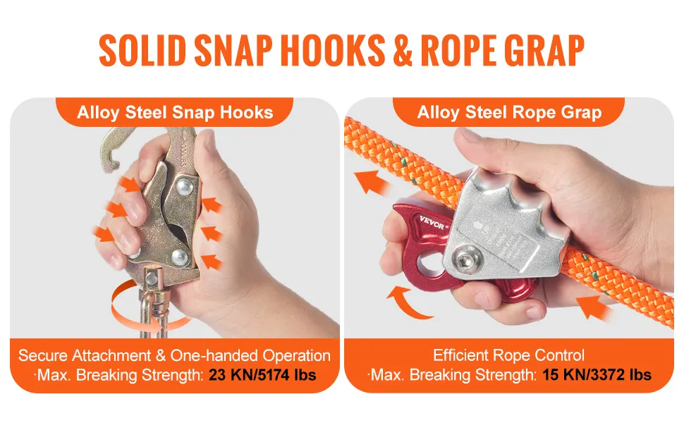 Experience ultimate security with our flip line, equipped with a robust swivel snap hook (23 KN/5174 lbs break strength) for a secure connection to your safety equipment. The aluminum alloy rope grabber (15 KN/3372 lbs break strength) enables seamless movement by easily adjusting the rope.