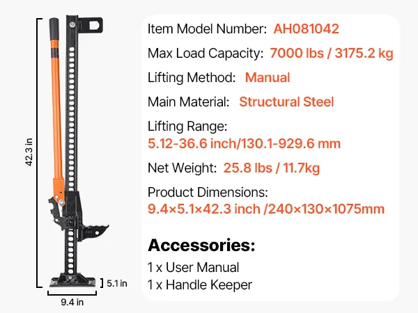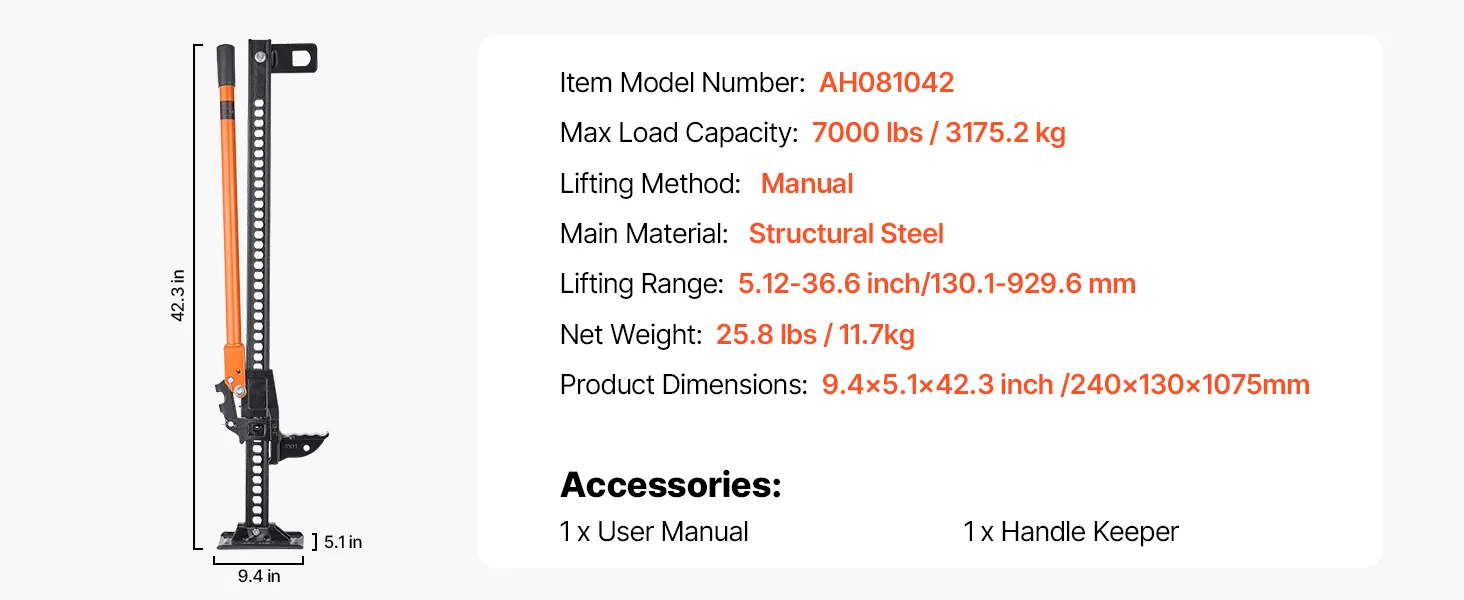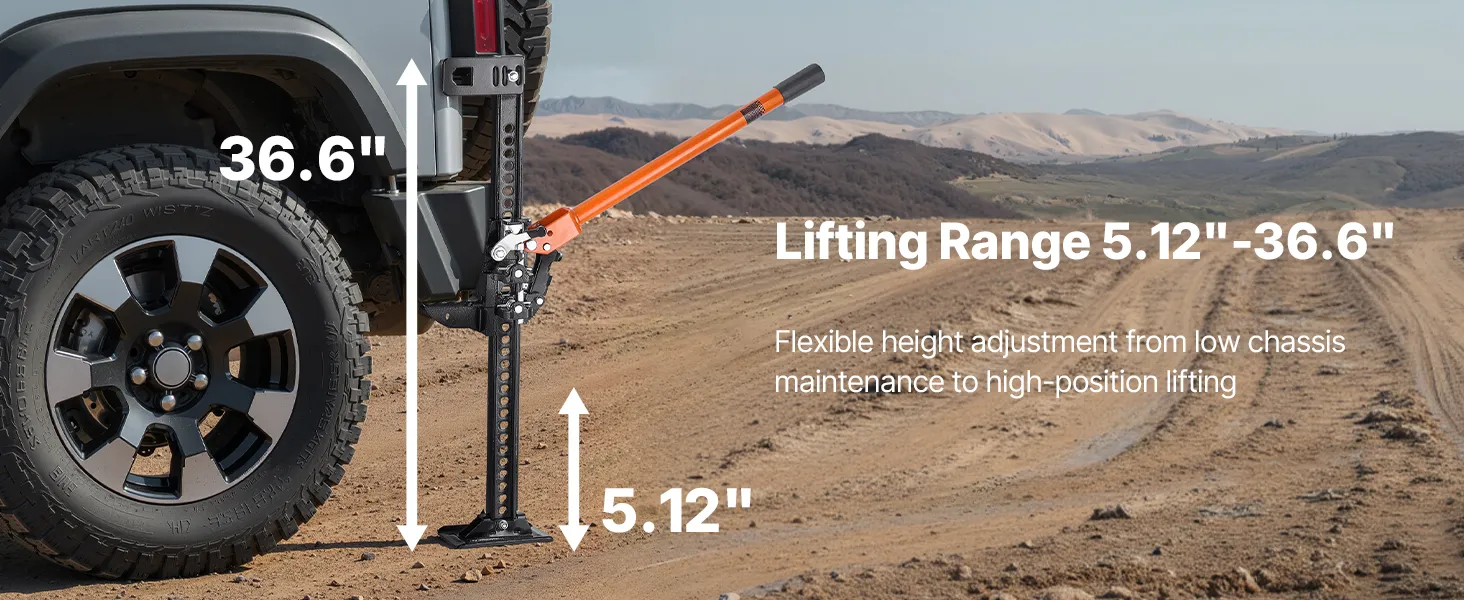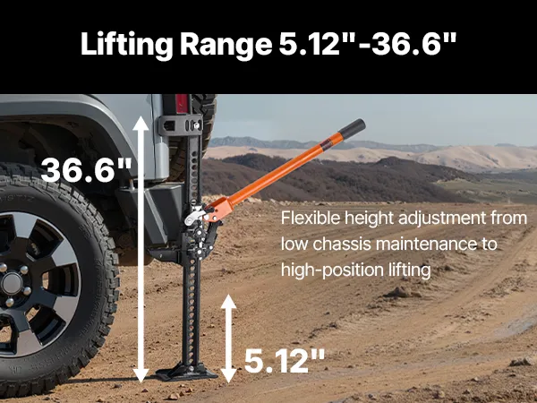 Wide Lifting Range: The lifting range is 5.12-36.6 in / 130.1-929.6 mm, with a manual operation design. The farm jack allows for flexible height adjustment, whether for small vehicles or large equipment, the jack offers precise adaptability
