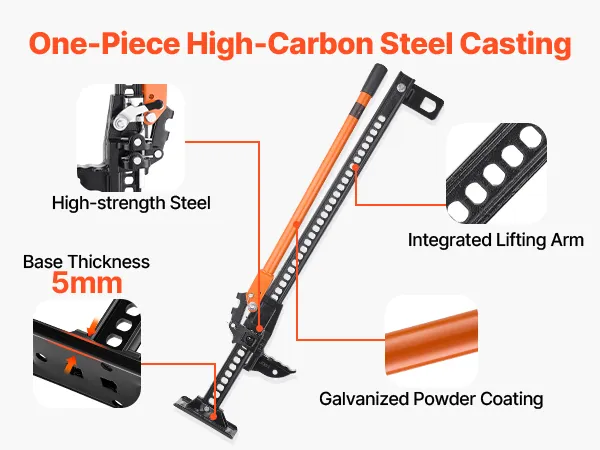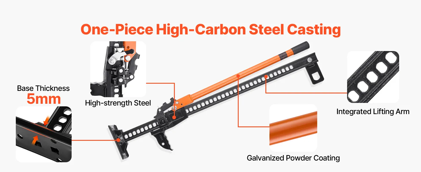 Durable and Sturdy Structure: Made from high-quality structural steel, our high lift farm jack has passed 50,000 lifting tests without deformation. The galvanized anti-rust coating ensures resistance to off-road and rough environments