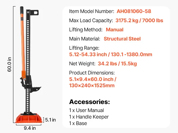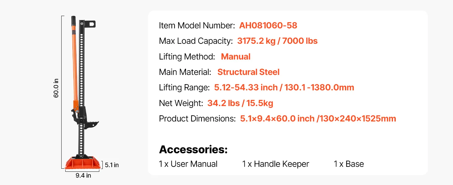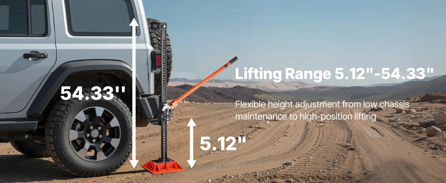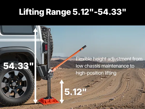 Wide Lifting Range: The lifting range is 5.12-54.33 in / 130.1-1380 mm, with a manual operation design. The farm jack allows for flexible height adjustment, whether for small vehicles or large equipment, the jack offers precise adaptability
