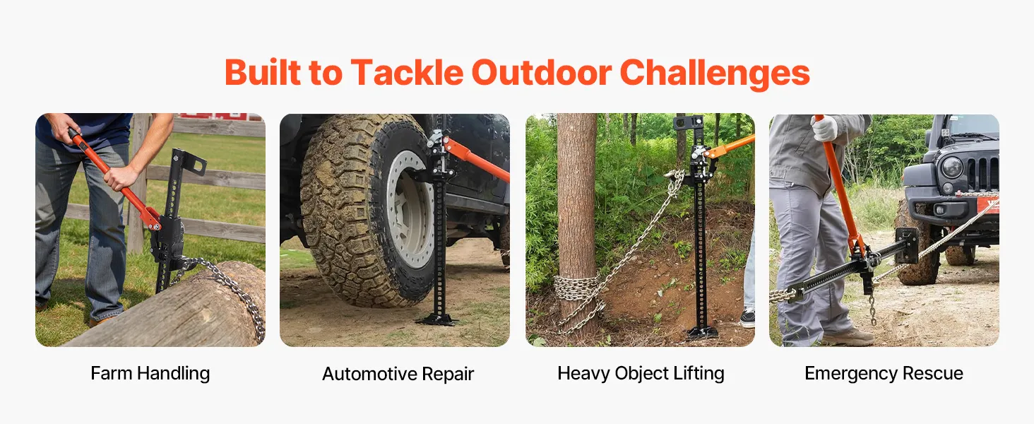 The farm jack is not only essential for a farm, but also suitable for truck repairs, warehouse handling, RV camping, and more, providing a one-stop solution for heavy equipment lifting needs.