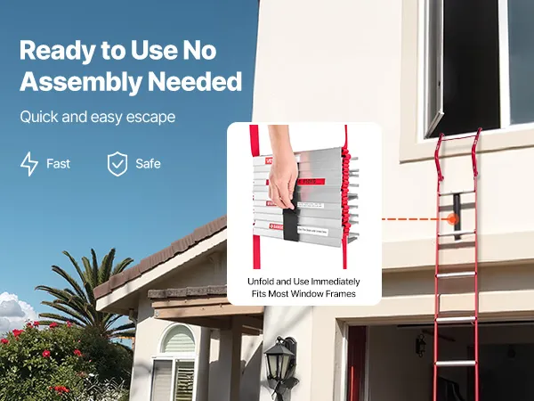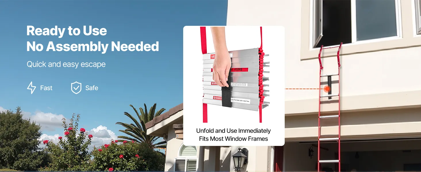 Our fire escape ladder requires no assembly and is easy to use. Simply unfold it for immediate use, and it is compatible with most window frames. (Note: The ladder's mounting hooks are extendable. Always extend both ends to their full length before use.)