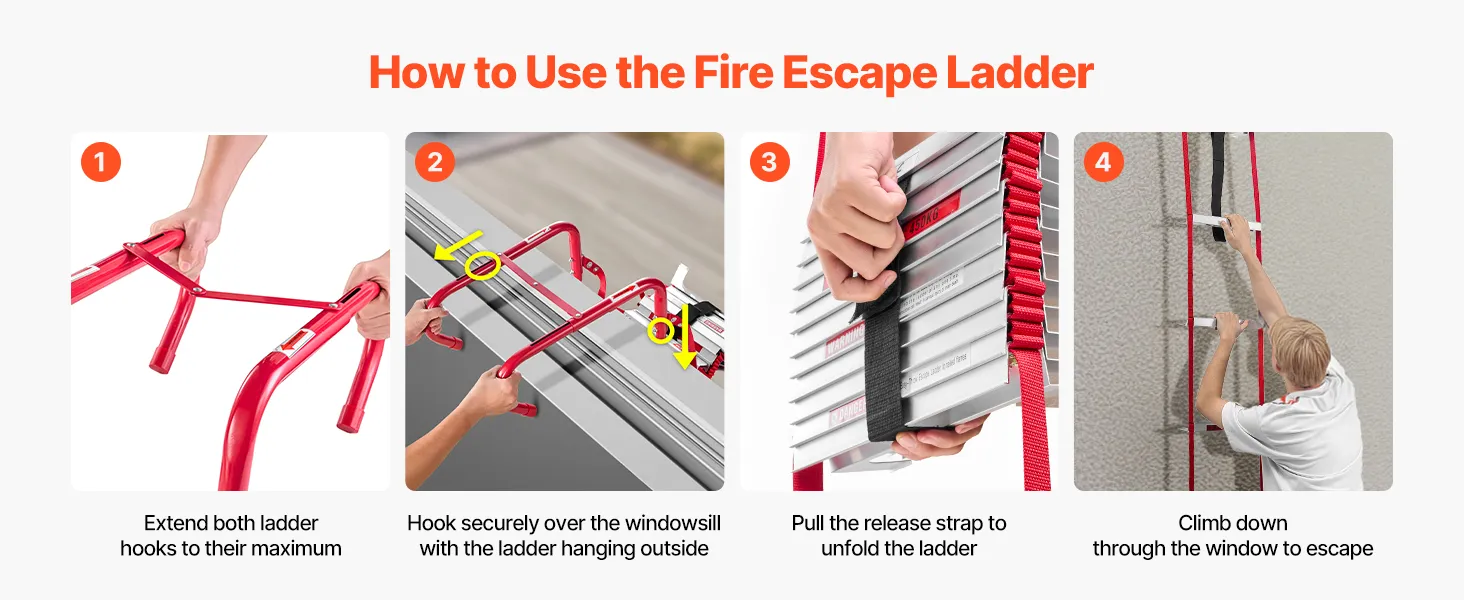 • Ready to Use: The VEVOR 5-6 story fire escape ladder is compatible with most window frames. No assembly required—just unfold and deploy instantly for a quick and easy escape in emergencies. (Note: The ladder's mounting hooks are extendable. Always extend both ends to their full length before use)