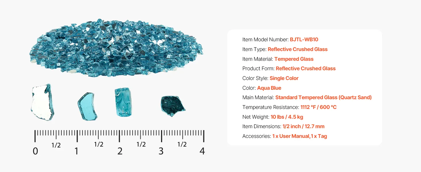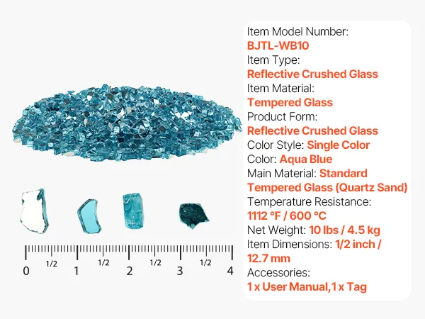 Vibrant Colors: 10 lbs / 4.5 kg of Aqua Blue reflective crushed tempered fire pit glass, size 1/2 in / 12.7 mm. It adds a luxurious touch to any setting, shining bright by day and flickering warmly by night, creating a cozy and romantic atmosphere