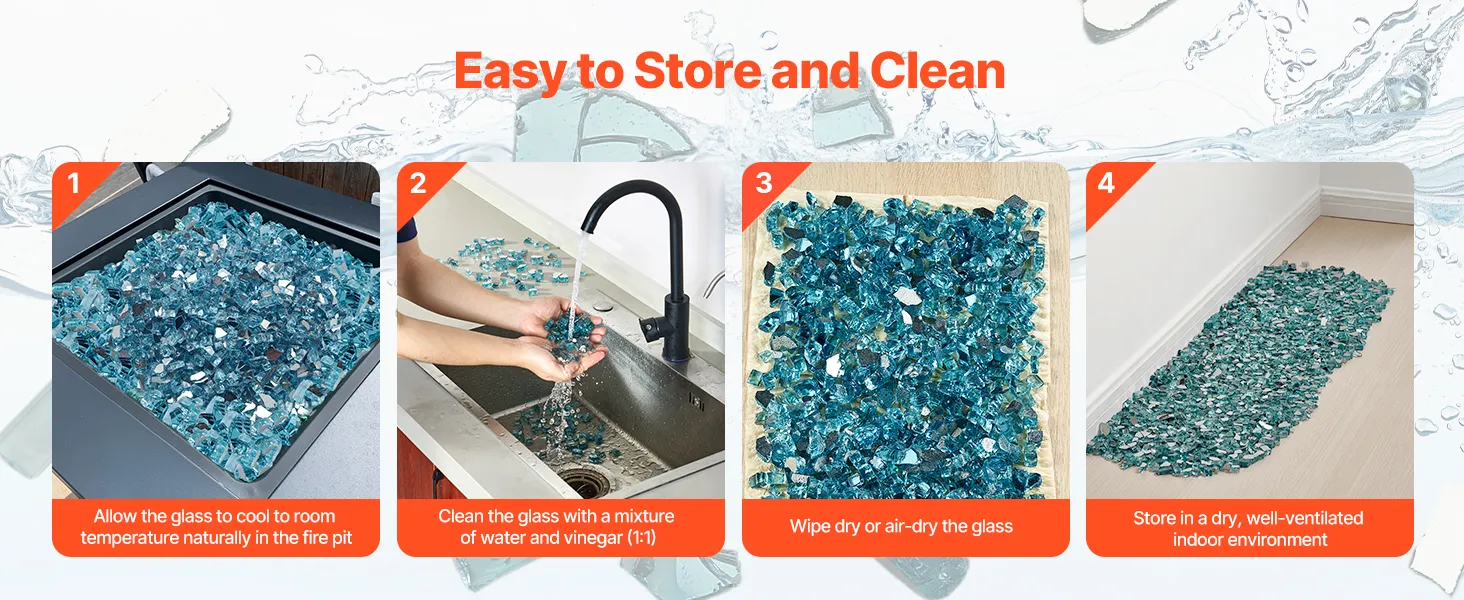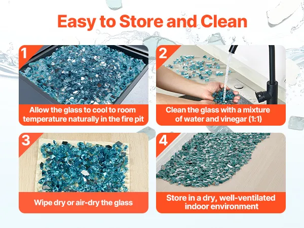 Convenient Storage and Cleaning: Our firepit glass rock is simple to store and takes up little space. Cleaning is super easy—just rinse with water and vinegar (1:1) to bring back its clear, shiny glow. Let it dry before using to avoid any cracking risks