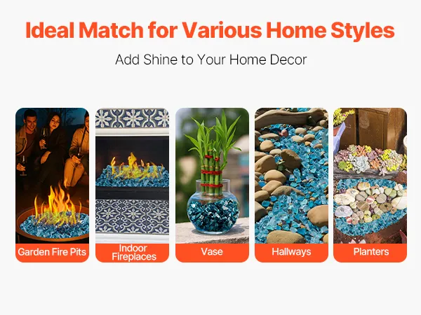 Our fireplace glass rock works great in garden fire pits, indoor fireplaces, aquariums, and more. It easily brightens up any space and adds a unique touch of charm.