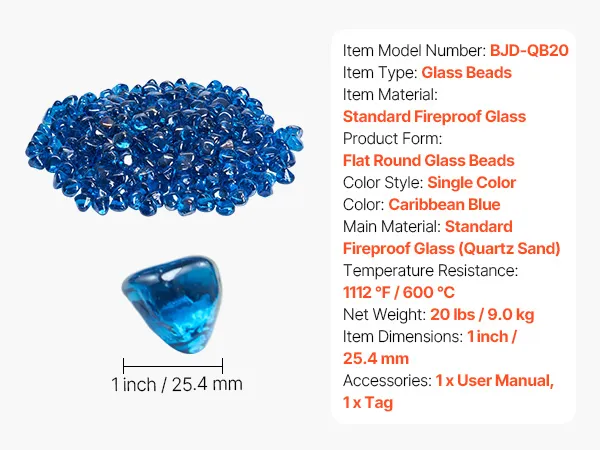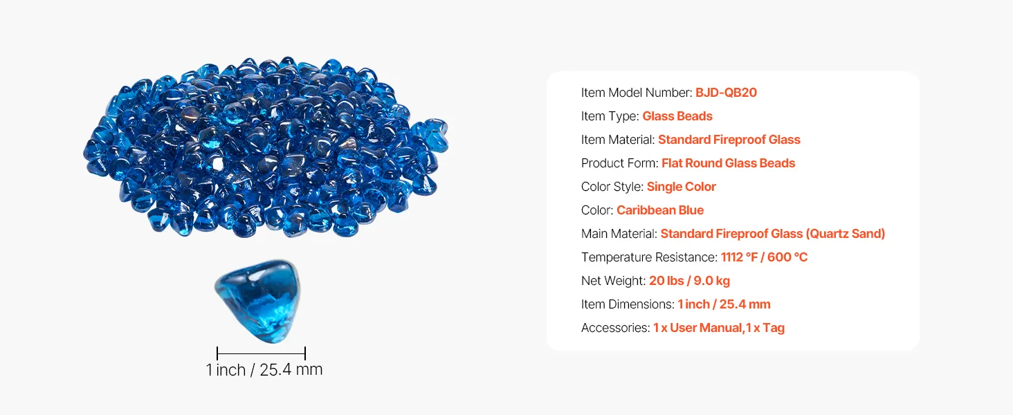 Vibrant Colors: 20 lbs / 9.0 kg of Caribbean Blue diamond fire pit glass, size 1 in / 25.4 mm. It adds a luxurious touch to any setting, shining bright by day and flickering warmly by night, creating a cozy and romantic atmosphere