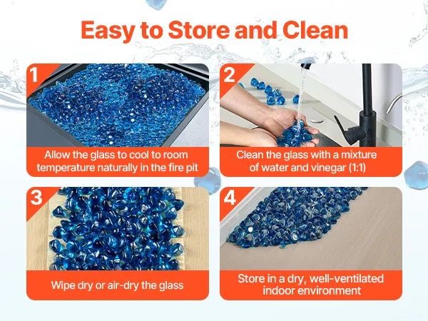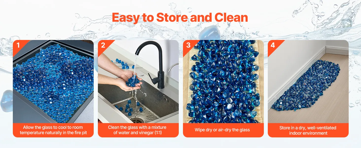 Convenient Storage and Cleaning: Our firepit glass rock is simple to store and takes up little space. Cleaning is super easy—just rinse with water and vinegar (1:1) to bring back its clear, shiny glow. Let it dry before using to avoid any cracking risks