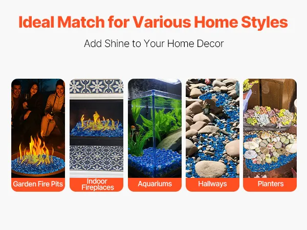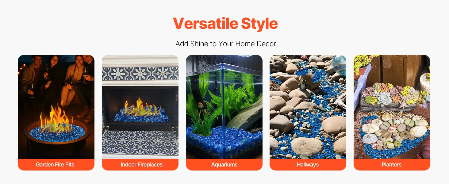 Our fireplace glass rock works great in garden fire pits, indoor fireplaces, aquariums, and more. It easily brightens up any space and adds a unique touch of charm.