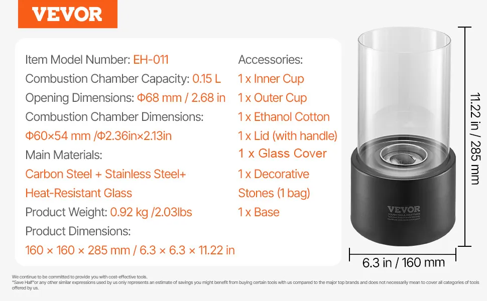 Compact and Lightweight: This tabletop fire pit measures 6.30 in (L) x 6.30 in (W) x 11.22 in (H) (16 cm x 16 cm x 28.5 cm) and weighs just 2.03 lbs (0.92 kg), making it easy to carry and perfect for outdoor use.