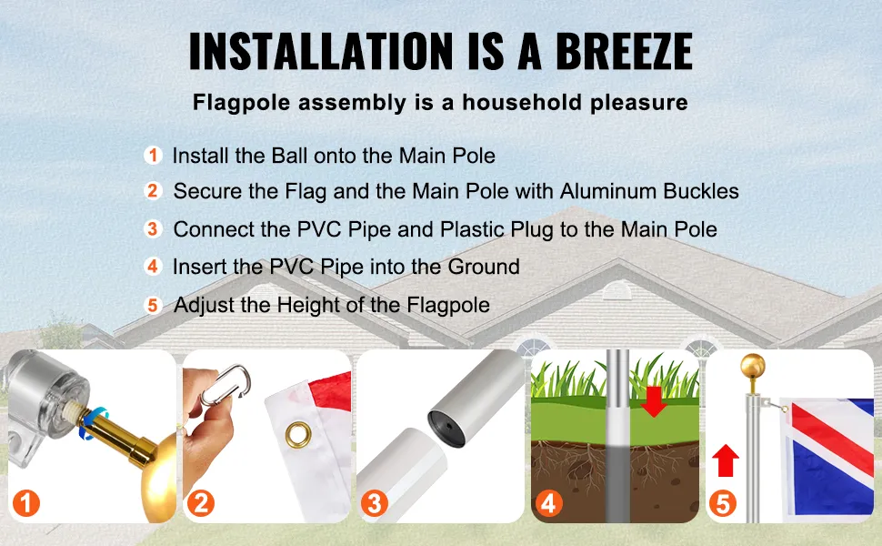 Our telescopic flagpole kit comes with detailed installation instructions, making assembly a breeze. From installing the gold ball on the main pole to securing the flag with aluminum clips and inserting PVC pipes into the ground, everything is straightforward, allowing you to enjoy the DIY process.