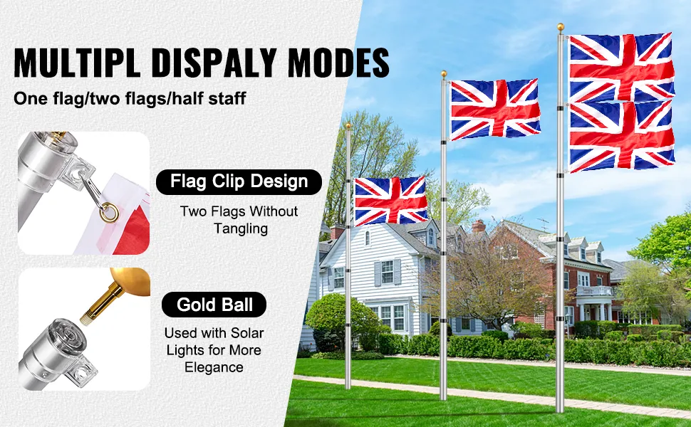 Multiple Display Options: Our telescopic flag pole supports 1 flag, 2 flags, and even half staff flag displays, suitable for diverse usage scenarios. Whether in yards, squares, or commercial spaces, our product offers the most suitable display options to meet your needs.