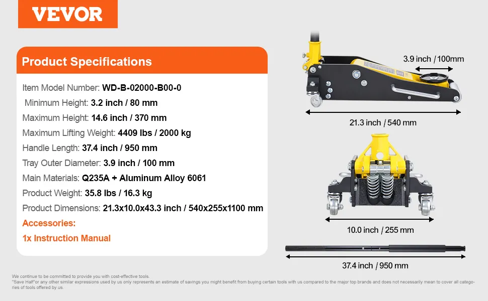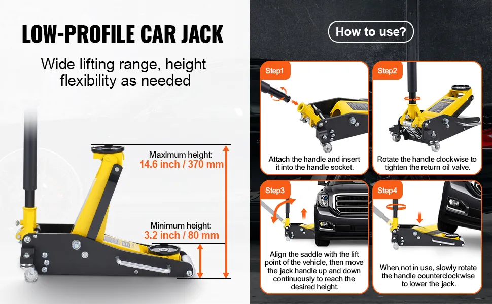 Low Lifting Height: The minimum lifting height is 3.2 inches / 80 mm, and the maximum lifting height is 14.6 inches / 370 mm. Its low clearance allows low profile floor jack to slide under lower vehicles while providing enough height to lift the vehicle off the ground. To lower the vehicle, simply rotate the jack handle counterclockwise.