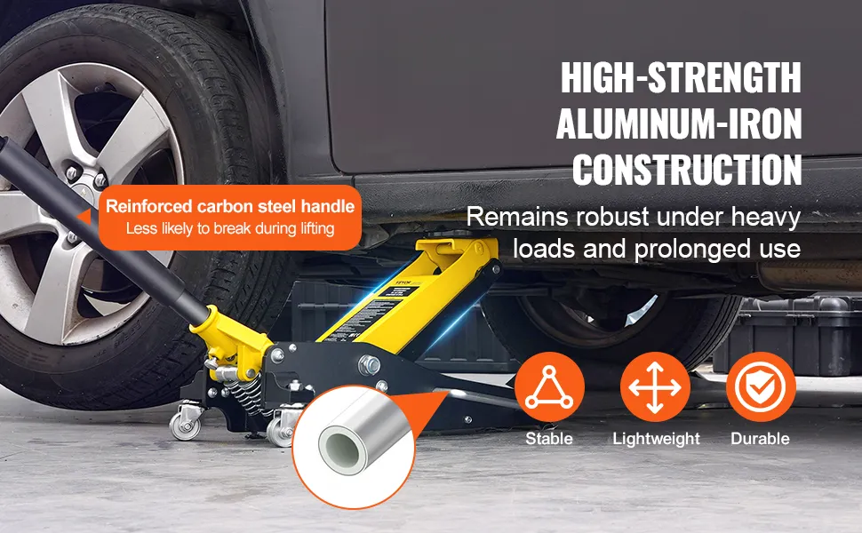 Sturdy Aluminum-Iron Construction: Featuring a welded frame design, the small floor jack remains stable during use. It combines the stability of iron with the lightweight properties of aluminum, reducing wobbling, deformation, and corrosion, making it easy to carry and use. The handle, made of carbon structural steel, is reinforced and thickened to prevent breakage during lifting.