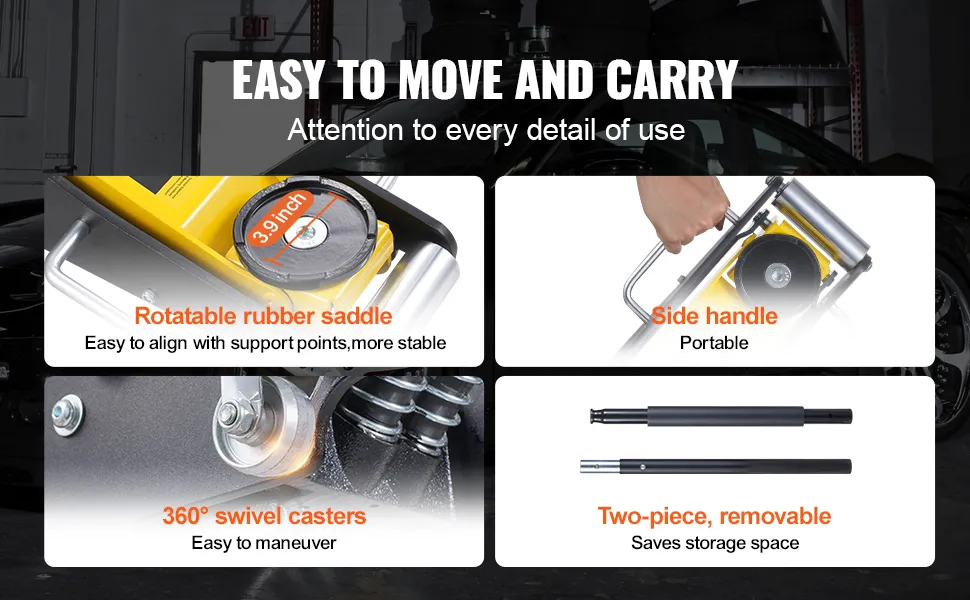 Equipped with a large rubber saddle to help protect your vehicle; dual side handles and swivel casters allow for quick and easy movement and transport of the jack; the handle is detachable.