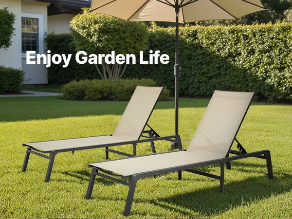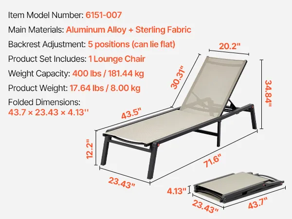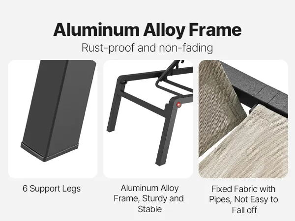 Aluminum Alloy Frame: Built with high-strength aluminum alloy steel tubing and supported by six aluminum legs, this outdoor chaise lounge chair holds up to 400 lbs, ensuring exceptional stability and durability for frequent outdoor use.