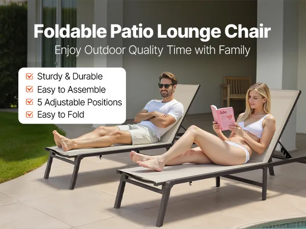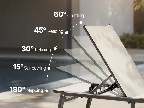 Adjustable Backrest: Our pool sun tanning chair features 5 reclining positions from upright to fully flat, perfect for sitting, resting, or napping under the sun or at night.