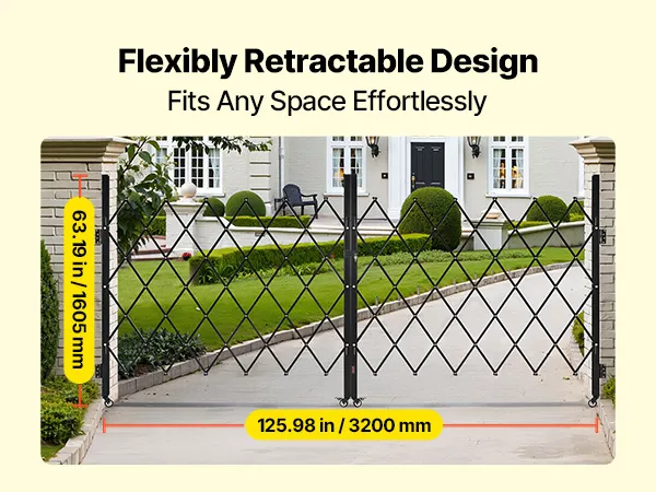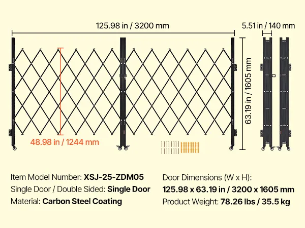 Retractable Folding Gate: The folding gate uses a retractable width structure. Maximum unfolded size: 125.98 x 63.19 in (W x H). Minimum folded width: 5.51 in. This standard size fits security doors, protective barricade gates, and defense facilities.