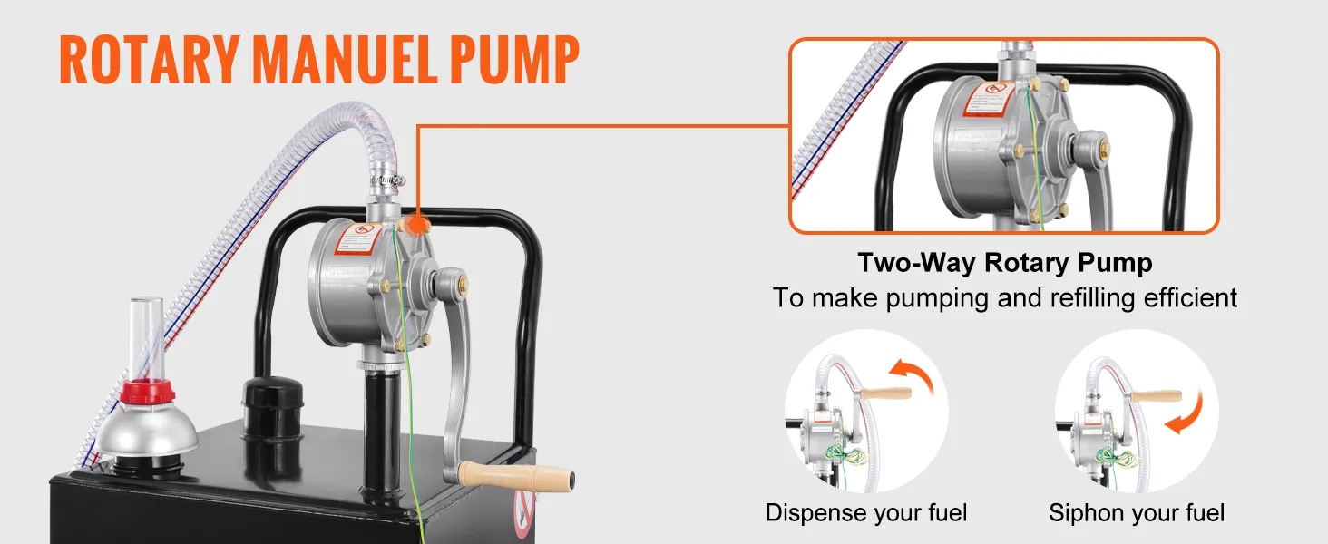 The manual transfer pump included with this caddy is efficient and simple to use. You can dispense fuel quickly without needing electrical power. The pump works with a simple crank mechanism, requiring minimal effort to operate. This system is ideal for use during power outages, guaranteeing you have fuel when needed. Manual operation ensures that you can use the pump in remote locations without relying on electricity.