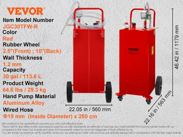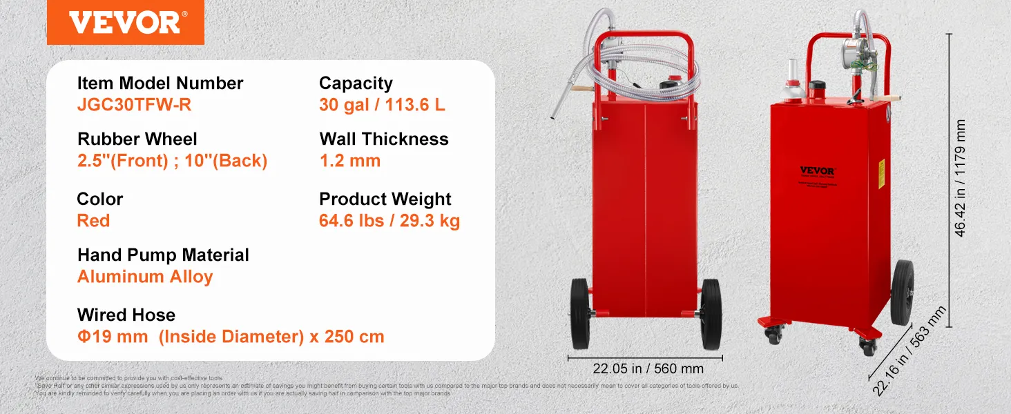 This VEVOR designed this fuel caddy for cars to ensure efficient fuel management. It is a reliable solution for storing gasoline, diesel, or kerosene. This fuel caddy helps reduce frequent trips to the gas station. It is an excellent option for keeping fuel ready in case of emergencies. The large gas storage tank capacity means you can store enough fuel for your vehicles or equipment. With this fuel caddy, you can have a steady supply of fuel on hand for those who need to refuel frequently. The sturdy design ensures durability and reliability. Our fuel cache makes the fuel storage system simple and efficient.