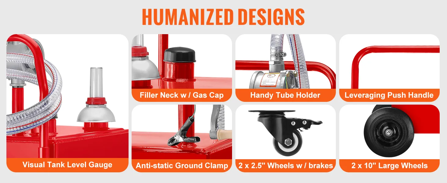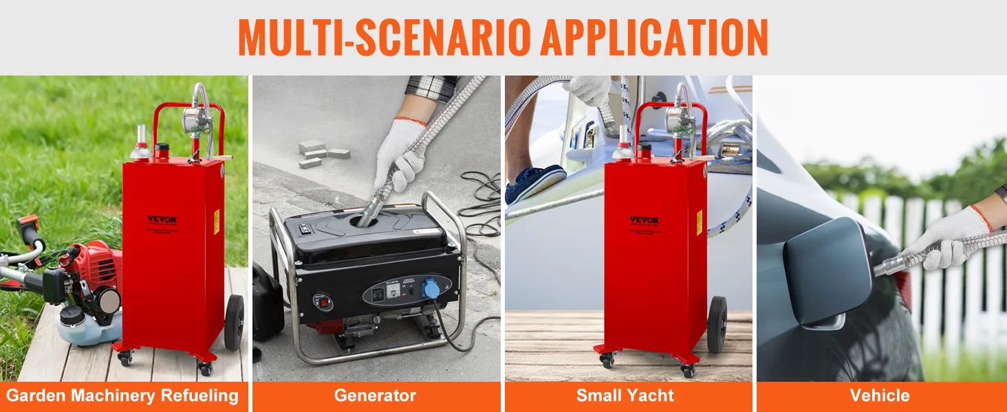 The VEVOR fuel caddy assembly is extremely simple to use. It has a four-wheel design that makes it simple to move, even when full. You can wheel it to your car, lawn mower, or any other equipment. This makes refueling quick and easy. These wheels are solid and durable. They provide stability and ease of handling. You won't have to lift heavy fuel containers anymore. Portability is especially beneficial for those with limited mobility. We recommend the fuel caddy as it can transfer across different surfaces with ease. Therefore, its design makes it simple to use for a variety of fueling needs.