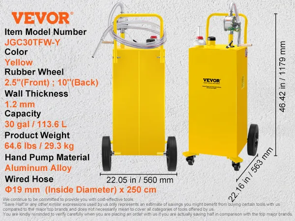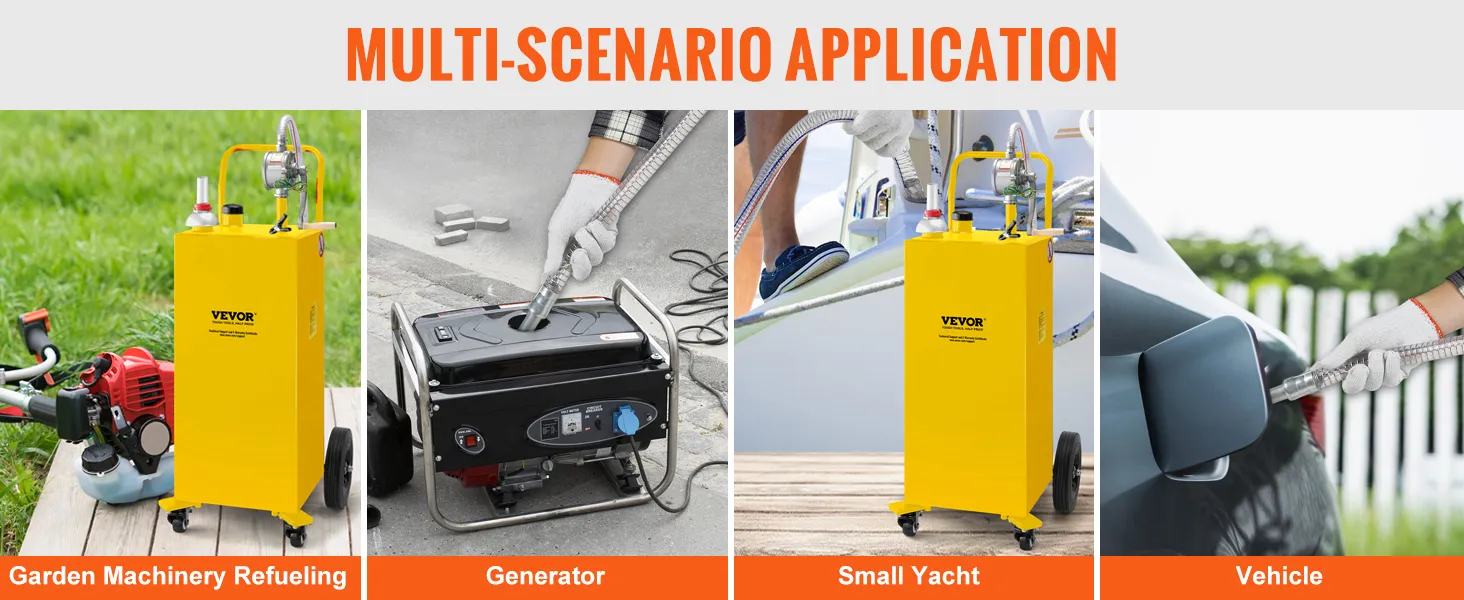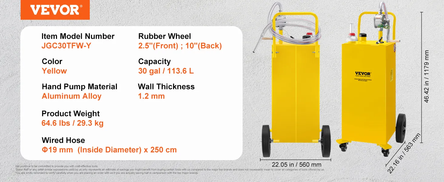 With a large 30-gallon capacity, it makes fueling up your car, lawn mower, ATV, or boat hassle-free. The fuel caddy helps prevent multiple trips to the gas station, saving you time and effort. Its easy-to-use manual transfer pump ensures quick and efficient fuel transfers wherever you need them. This VEVOR 30 gallon fuel caddy is a dependable and practical fuel storage option for both home and professional use.