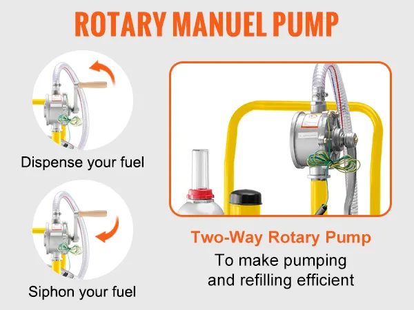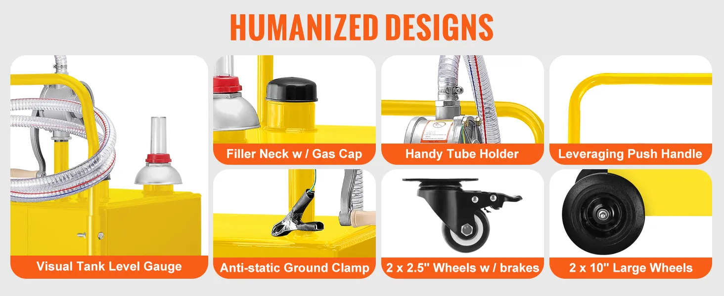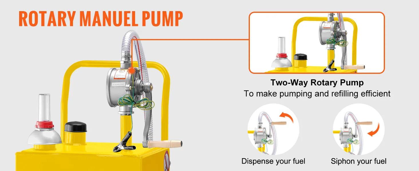 This fuel caddy has a manual transfer pump, which makes fuel transfer effortless. The two-way rotary pump allows for efficient fuel dispensing and suction, making it dependable during power outages. Manual transfer pumps ensure you can safely and effectively transfer fuel whenever needed. The inclusion of a reliable hand pump improves the overall functionality of the VEVOR 30 gallon fuel caddy.