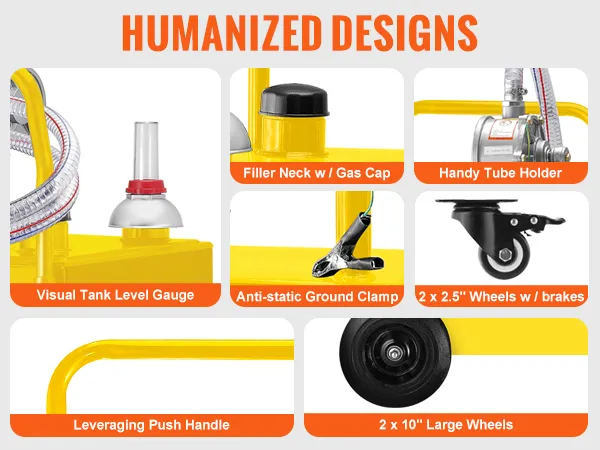 This feature allows you to conveniently position the caddy wherever you need fuel, making fueling more accessible. The simple mobility and sturdy wheels of the VEVOR 30 gallon fuel caddy make handling heavy fuel loads easier. You can easily roll this fuel caddy to any location because of its solid rubber wheels. It has large, durable wheels that ensure smooth mobility on various surfaces, including gravel and paved areas. This simplifies fuel management considerably.