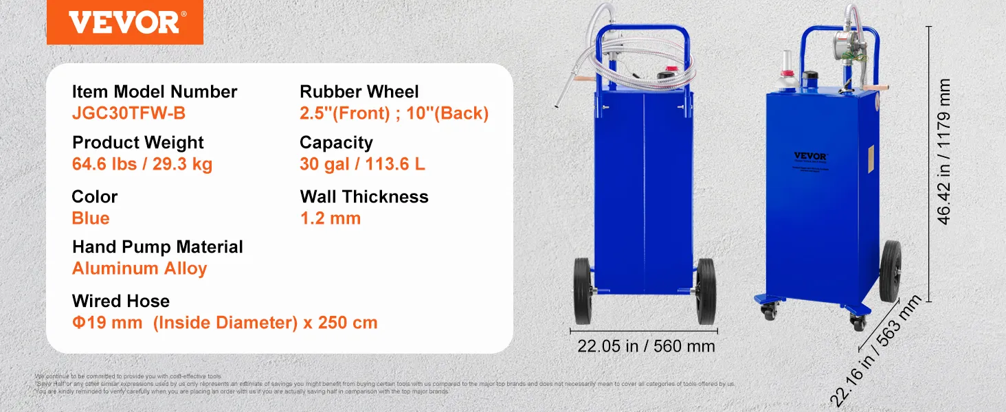 The 30 gallon fuel caddy’s heavy-duty wheels make it easy to maneuver through various terrains, even when the tank is full. The large wheels ensure stability and smooth movement, making the fuel caddy suitable for both indoor and outdoor use. Hence, this feature enhances the caddy's portability, making it easier to operate. This practical solution benefits anyone needing to relocate fuel storage.
