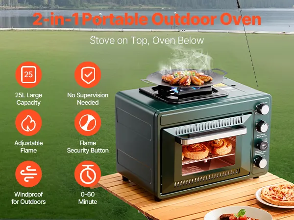 • 2-in-1 Quick Cooking: Our high-performance stove combined with a full-function oven, featuring a stove on top and an oven below. This versatile design saves time and effort for efficient outdoor cooking