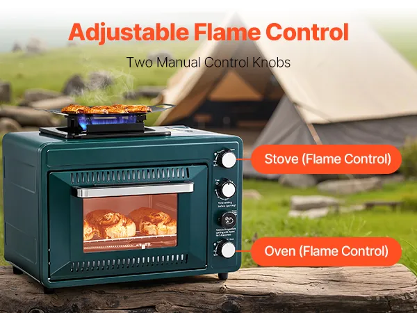 • Adjustable Flame Control: Two adjustable knobs for precise heat control, allowing you to adjust the flame for different ingredients. This camping oven heats up quickly, reaching 518℉/270℃ in 10 minutes and 662℉/350℃ in 15 minutes, saving time while cooking delicious meals