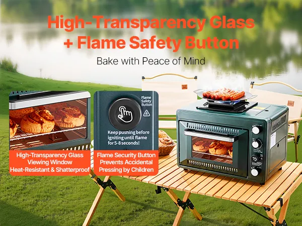 The glass viewing window allows you to check the food's status without opening the oven door, which helps retain heat and improve cooking efficiency. The flame security button ensures effortless cooking.