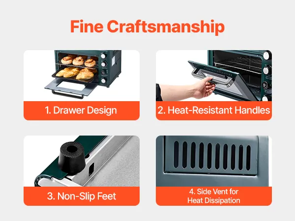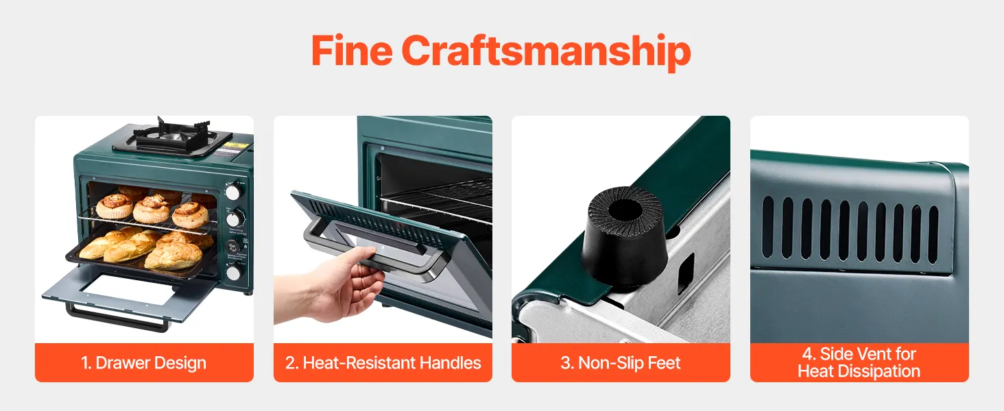 The outdoor gas camping oven features a drawer-style design with a heatproof handle to avoid food residue from falling. Non-slip feet at the bottom ensure stable cooking for better results.