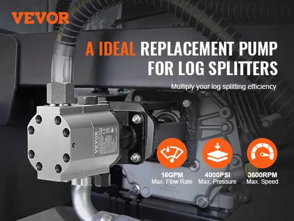 The VEVOR log splitter pump kit is powerful and great for splitting wood. It can reach a speed of 3600 RPM and has a high pressure of 4000 PSI. It also has a flow rate of 16 GPM. This allows it to work quickly and strongly. This excellent pressure and flow rate make it perfect for handling all types of wood easily.