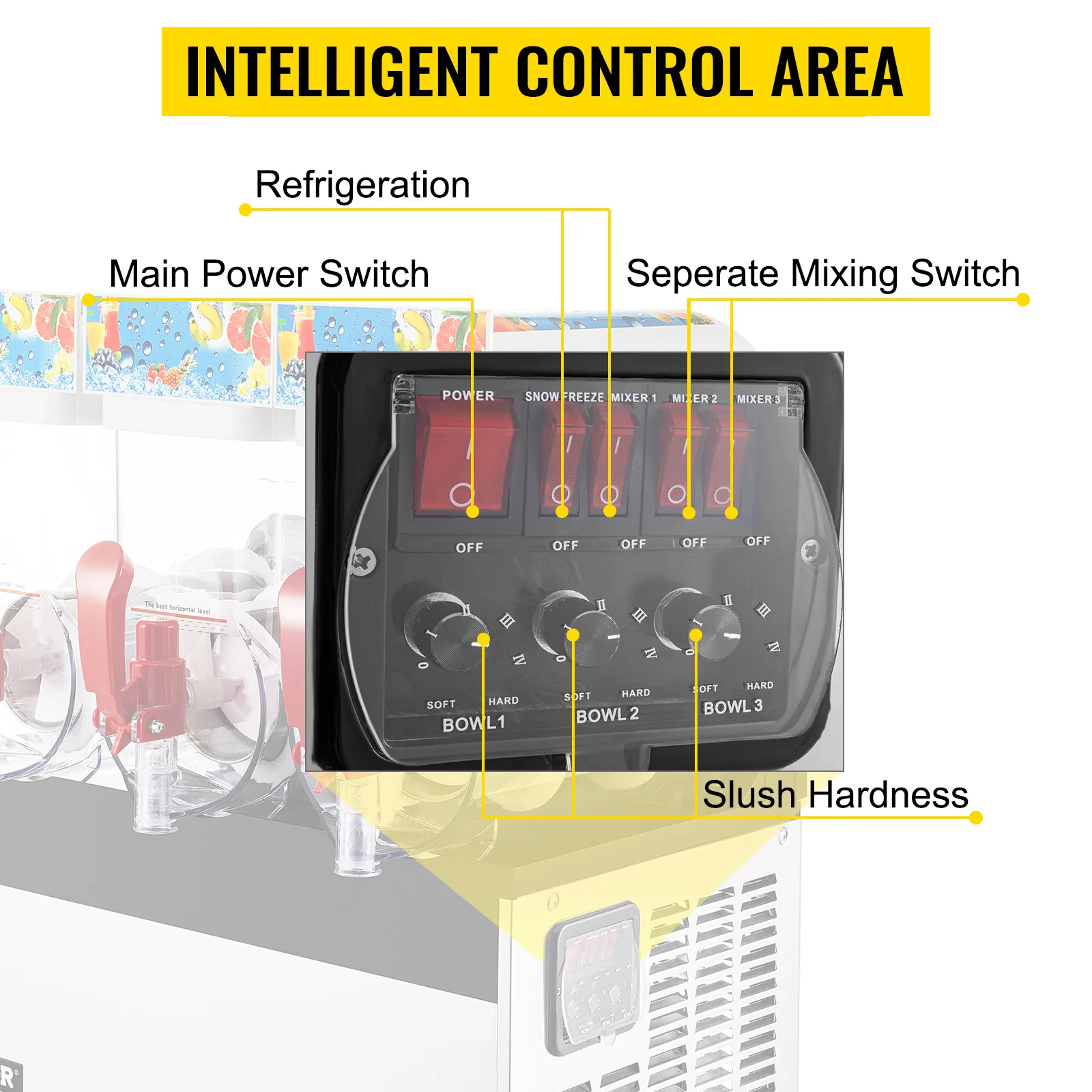 With separate switches to independently control the cooling and mixing. The mixing switch for avoiding the sediment down to the bottom of the tank, facilitating the even slush-making.