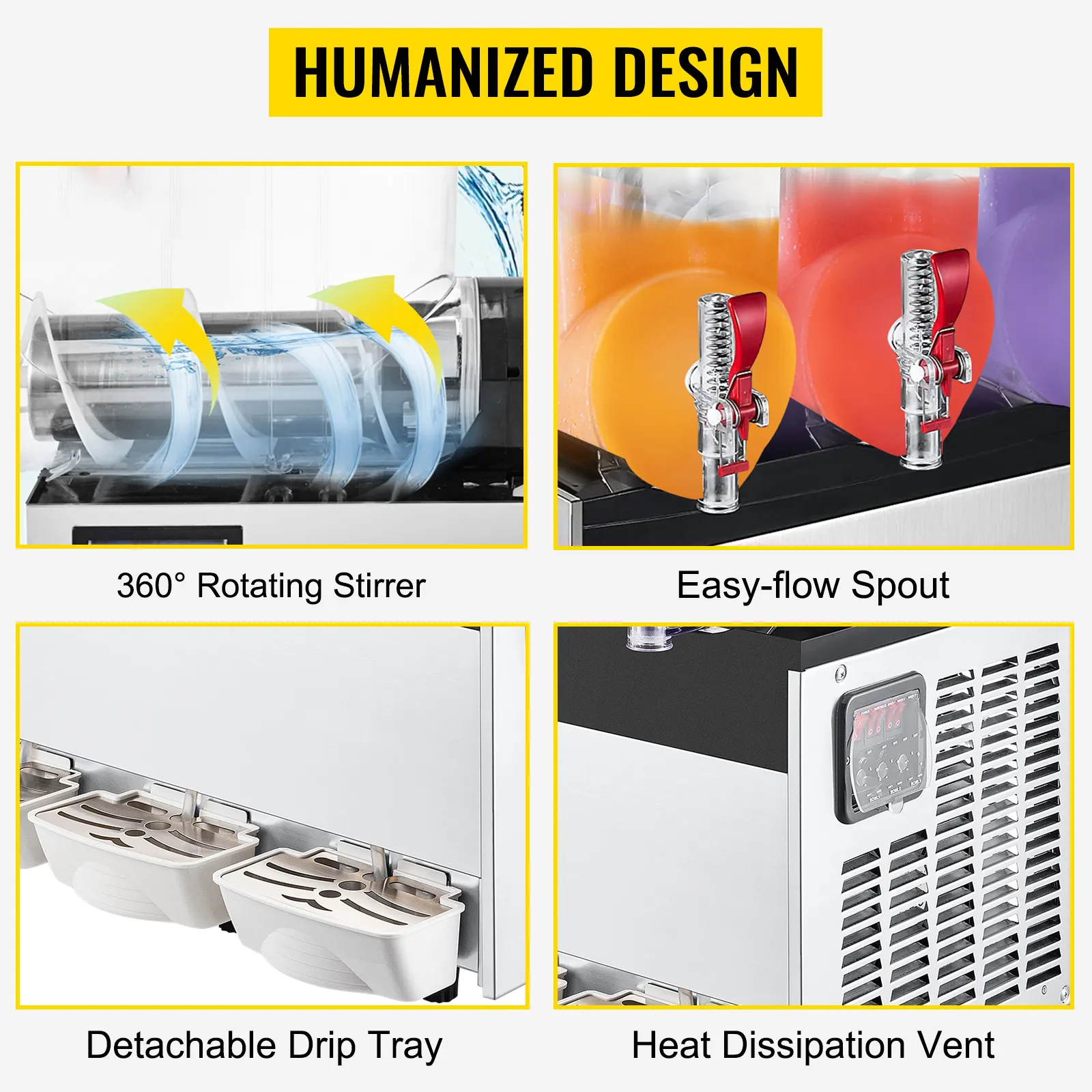 The large discharge faucets allow for quicker dispensing; Large-area air vents for efficient heat dissipation; The nonslip feet for the stability of the machine; Detachable drip trays effectively prevent the beverage from overflow.