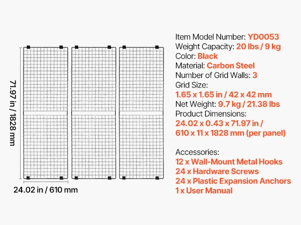 Convenient Storage & Display: Our grid wall panels come with 3 large grid panels, each sized 24 x 72 in / 610 x 1828 mm. You can be freely combined with clips and hooks (not included) to meet diverse user needs for easy item storage and nice display