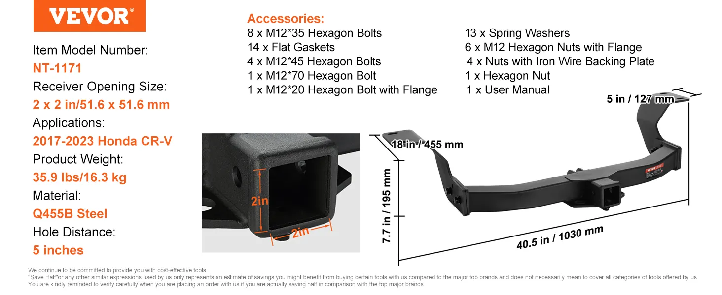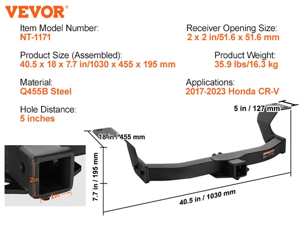 • Fit like a Glove: Slide into adventure with our trailer hitch! It is compatible with the 2017-2023 Honda CR-V, ensuring a perfect fit with the car's chassis gaps and holes for seamless installation. Installation Hole Size: 0.6" x 1.2"; Hole Spacing: 38.4"; Lock Pin Hole Diameter: 0.7".