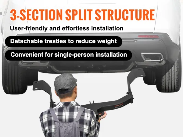 • Installation? A Breeze: No need for a team. Our hitch receiver with detachable trestles splits into three, making it light and manageable. A single pair of hands can lock it in place, and those high-strength bolts? They promise to hold on as tightly as you grip the wheel.