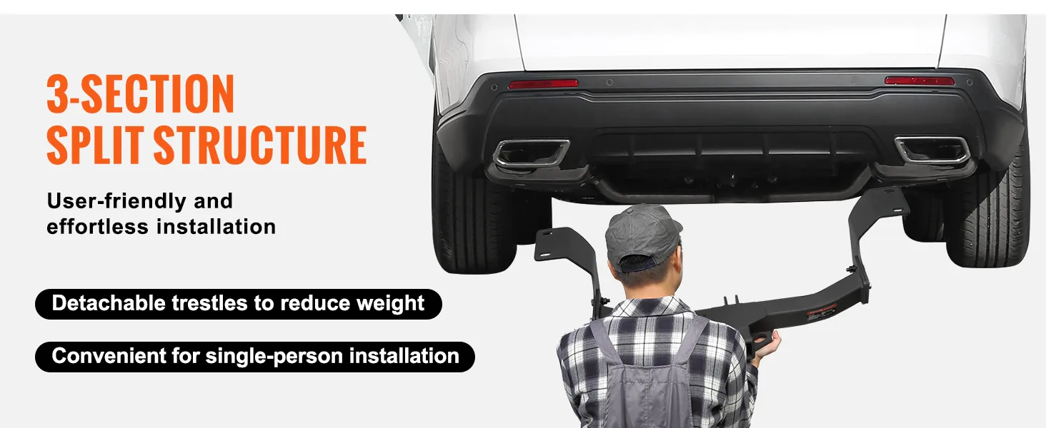 Installation is a cinch with our hitch receiver's unique three-part design, split into left and right trestles. Lighter in weight, it's a breeze for solo setup.