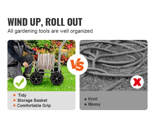 The VEVOR garden hose storage has an ergonomic design. It ensures it stays in place even when fully loaded with weed. The wide base and solid wheels provide extra stability. Our crank handle is designed for ease of use. Winding and unwinding the hose is effortless. This stability and ease of use make it a practical addition to any garden or yard. The handle's design prevents water tangles, making your gardening tasks smoother and quicker.