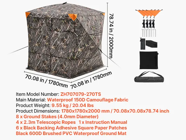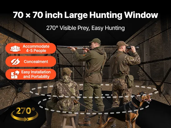 Spacious Design: Dimension: 70x70x79 in. With large interior, our turkey deer blind tent can accommodates 4-5 people. Diamond-pattern warning fabric is detachable to increase visibility. It provides standing experience, 270°/360° two-way view